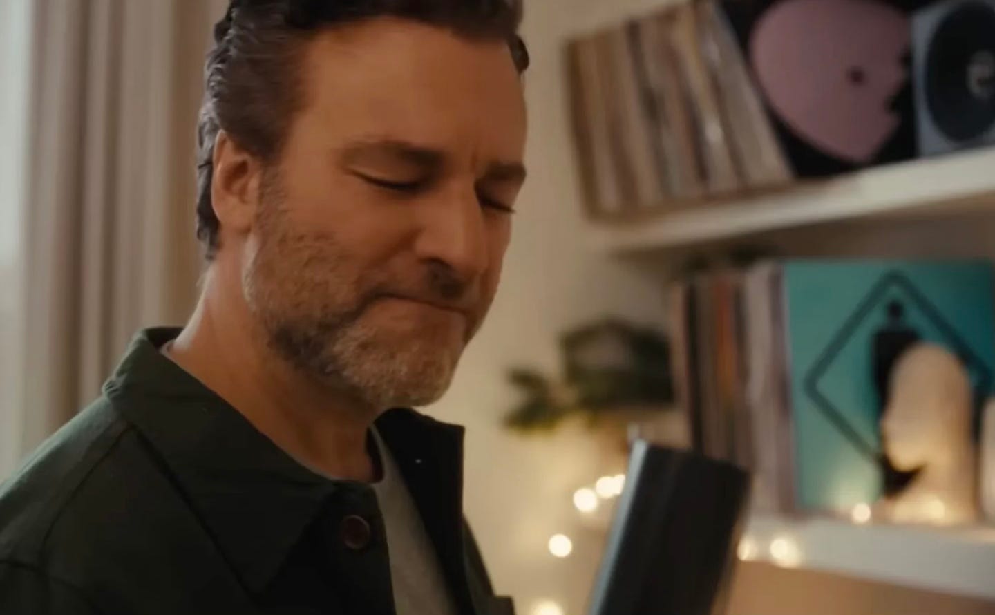 For now, ignore the dad, who is in the grip of a deep depression, and look at the record sleeves behind him. On the top shelf, elevated in the hierarchy, is the symbol of the feminine: a soft pink, circular form. Immediately beneath it is the symbol of the masculine: a teal blue, square form. These contrasting motifs will recur throughout the ad: blue vs pink, square vs round. In this particular shot, the square is tilted to become a warning graphic, containing the simplified figure, which is a nod towards toxic masculinity.